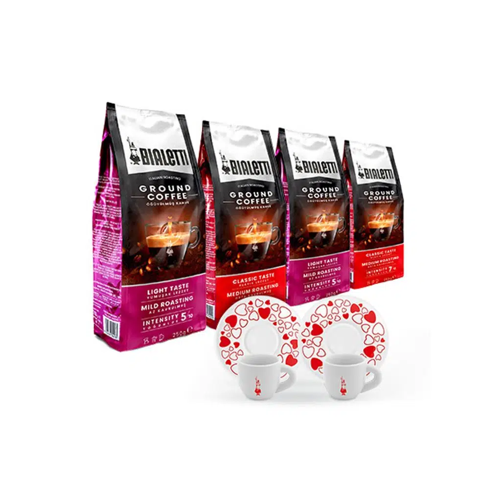 | Etiketler | Bialetti Delicato Ve Classico Öğütülmüş 250 gr 4 Adet Alana 2'li Espresso Kalpli Fincan Seti Hediye |