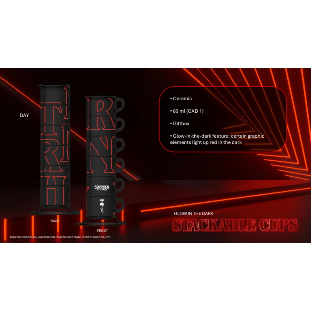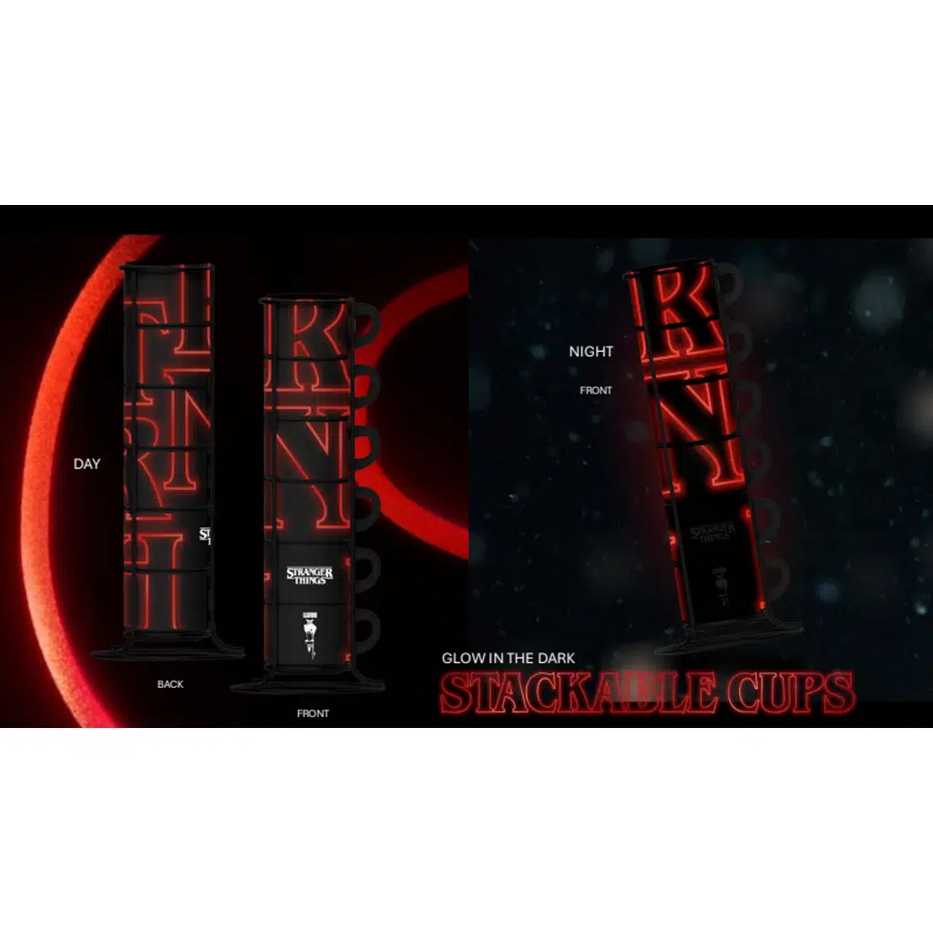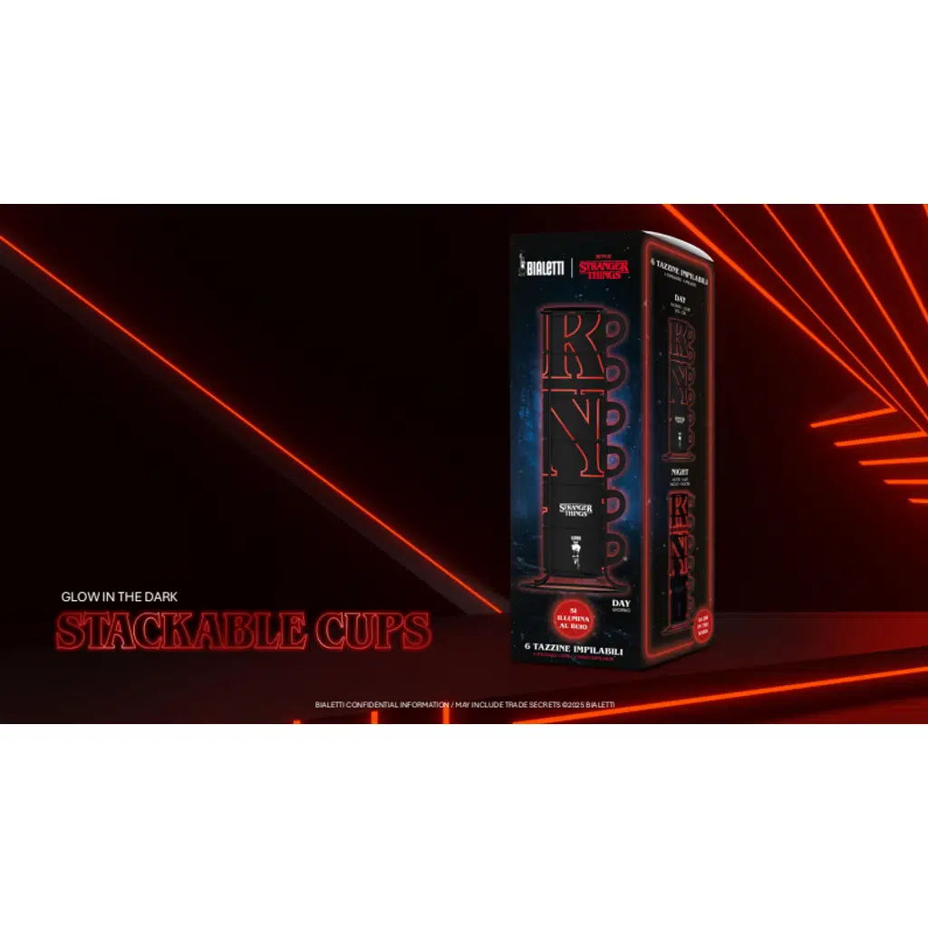 Karanlıkta parlayan ürünler arasında, üst üste istiflenebilen Bialetti fincan seti mutlaka sahip olunması gereken bir parça. Üst üste istiflenmiş altı siyah espresso fincanı, ikonik Stranger Things harfleriyle kaplı. Karanlıkta parlayan efekt, kırmızı yazının aydınlanmasını sağlayarak ikonik Stranger Things harflerini yeniden yaratıyor.