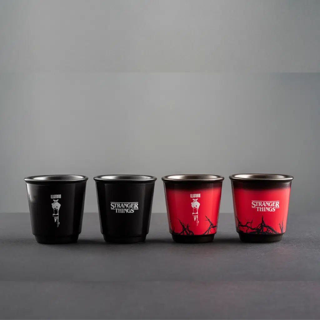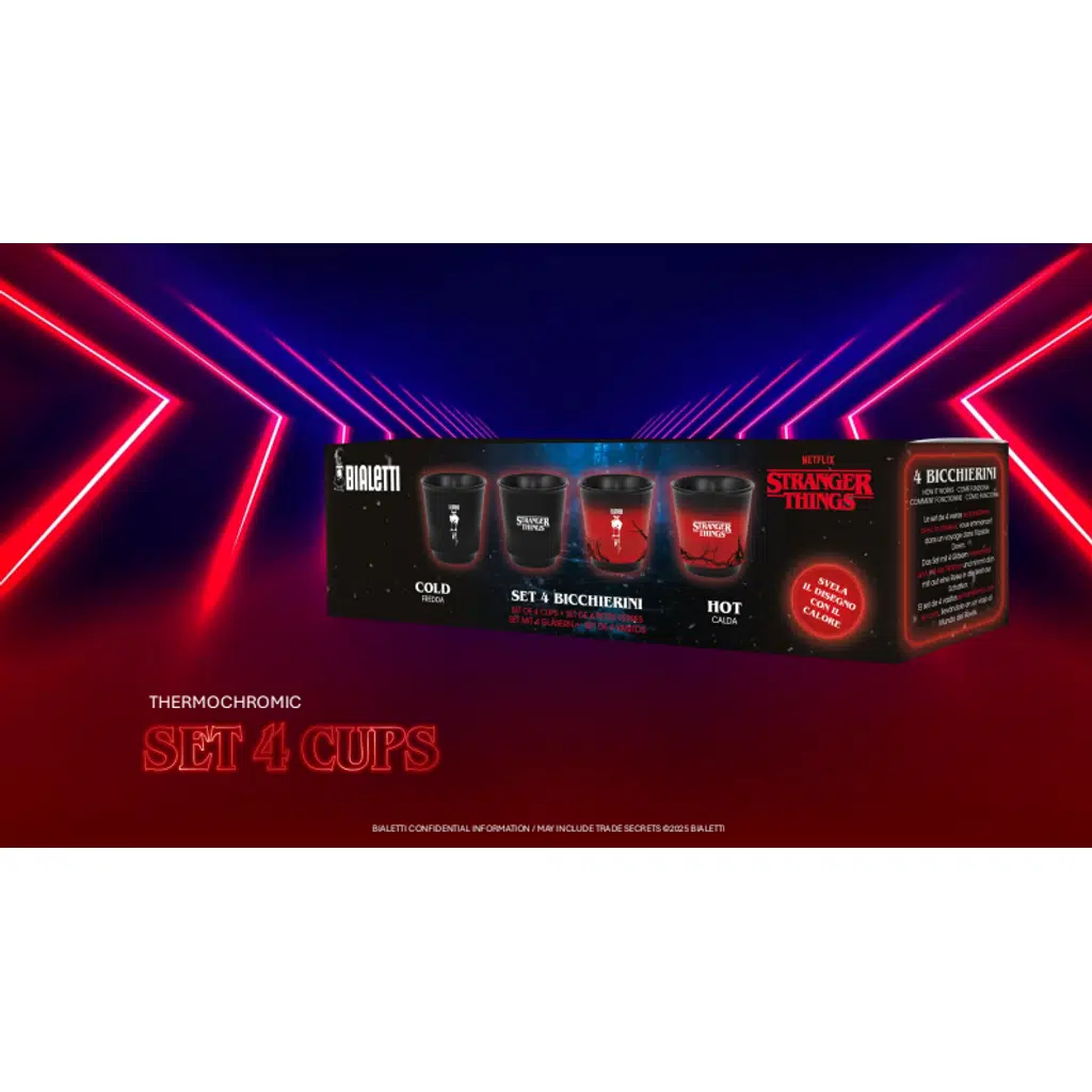 Bialetti ve Netflix, Stranger Things'ten ilham alan yeni bir shot serisi. Isıya duyarlı etki olağanüstü. Seramik, ısı ile temas ettiğinde değişiyor. Dört adet Stranger Things shot seti. Soğukken fincan siyah görünür. Kahve döküldüğünde fincan kırmızıya döner ve farklı desenler ortaya çıkarır. Kahve döküldüğünde fincan kırmızıya döner ve farklı desenler ortaya çıkarır.