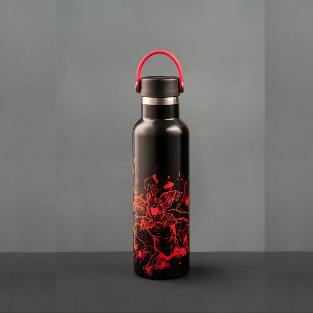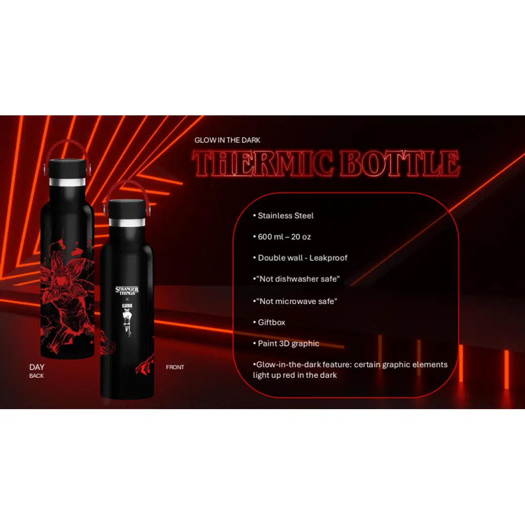600 ml'lik çift duvarlı termos şişe Karanlıkta parlayan efekt, Demogorgon'un kırmızı renkte parlamasını sağlıyor.